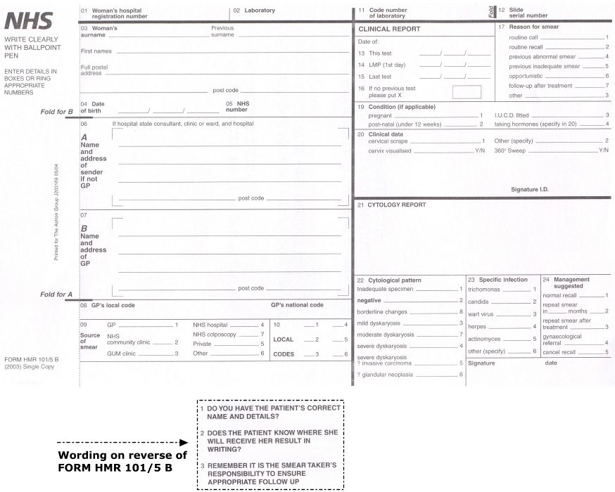 Printed-back forms have been amended to replace instructions on 'taking a cervical smear' with the following prompts: